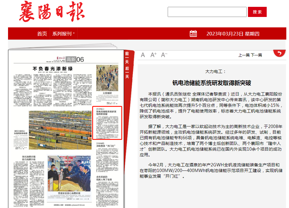 襄阳日报:大力电工钒电池储能系统研发取得新突破